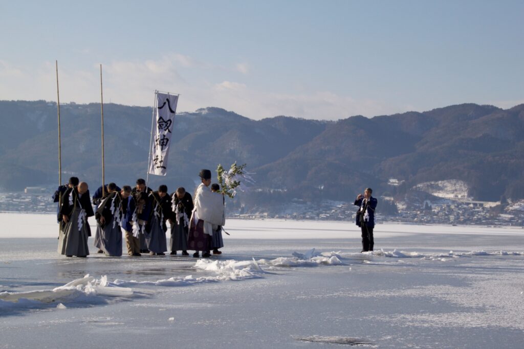 御神渡りを願う八劔神社氏子衆の三十五日の祈り。早朝の御神渡り観察と八劔神社参拝がセットになったプラン